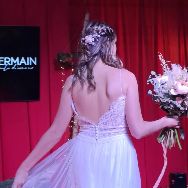 Je réalise tout type de coiffure de mariée à thème, avec ou sans rajouts, pour un rendu professionnel et une tenue impeccable toute la journée.